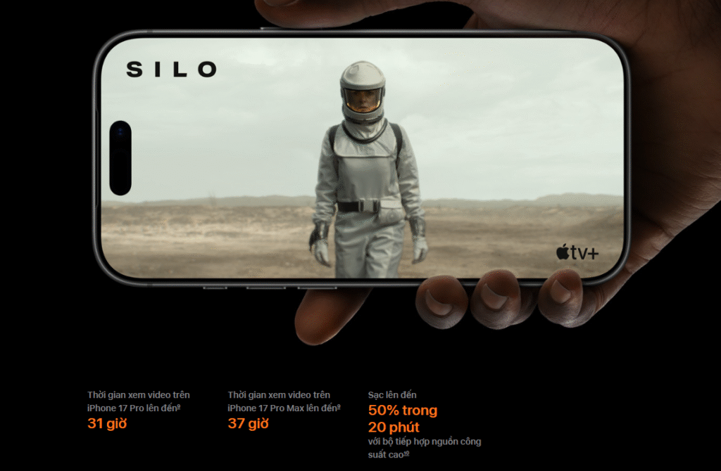 iPhone 16 Pro trang bị pin 3.600mAh, kết hợp tối ưu từ chip và iOS nên vẫn đáp ứng tốt nhu cầu sử dụng cả ngày. Trong khi đó, iPhone 17 Pro nâng lên 4.252mAh, cho thời lượng xem video tới 31 giờ nhờ thiết kế unibody và quản lý năng lượng từ A19 Pro + iOS 26. Máy hỗ trợ sạc nhanh USB-C 40W/60W, đạt 50% trong 20 phút, cùng hệ thống tản nhiệt giúp hiệu suất ổn định lâu dài.